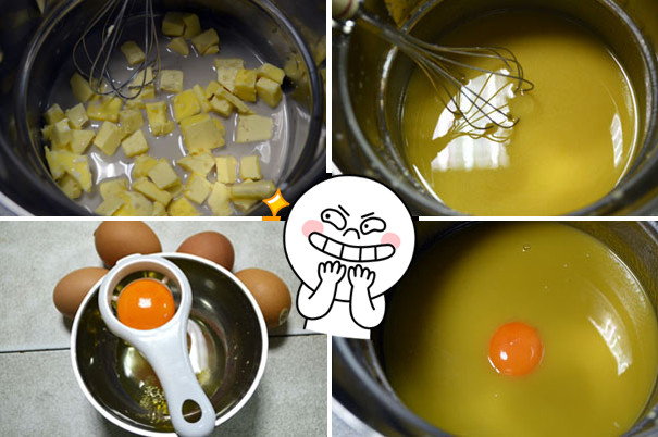 與材料均勻混合 奶油融化 將蛋白蛋黃分離